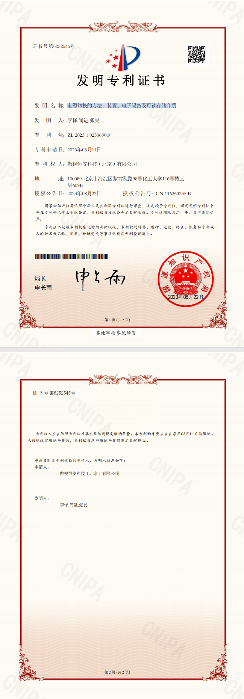 祝贺我公司取得“电源切换的方法、装置、电子设备及可读存储介质”专利证书